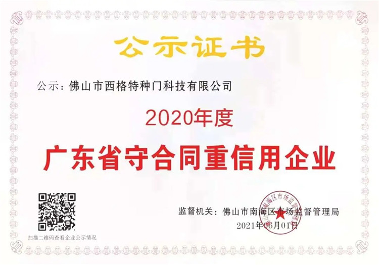 品牌榮譽(yù)|西格榮獲“2020年度廣東省守合同重信用企業(yè)”稱號(hào)
